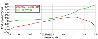 e) 공진주파수 = 750MHz, 공진시 저항 = 71.1Ω