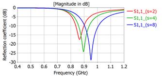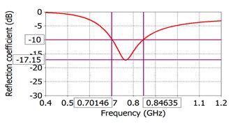 Antenna f(MHz) for min (S11) Δf(MHz) for |S11| < -10dB max(Gabs)(dB) Rin(ohm) at resonance
