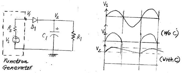 Vs = Vs1, C1 = 사용, D1 = 사용, R1= 제거, V1을 오실로스코프로 측정