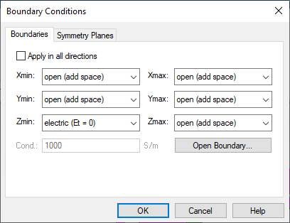 Simulation, Boundaries, Boundary Conditions, Zmin: choose the electric(Et=0),