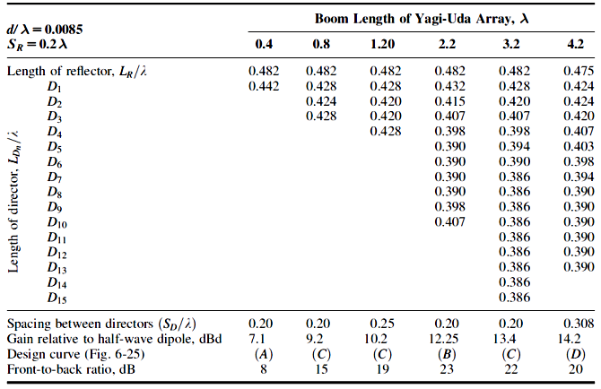 표: 야기 안테나 설계치수(금속 지지대가 없는 경우)[Viezbicke]