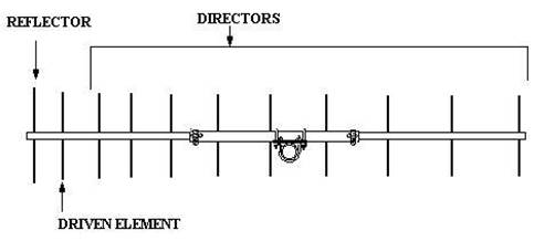 ㅇ 지향기(directors): 급전기 앞에 급전기보다 약 5% 잛은 연결된 도선. 갯수에 따라 이득 증가. 갯수가 증가함에 따라 이득 포화, 길이 약 0.40파장. 급전기와 지향기 간격: 0.075–0.40파장 (설계에 따라 다름). 균일 간격 또는 비균일 간격 적용