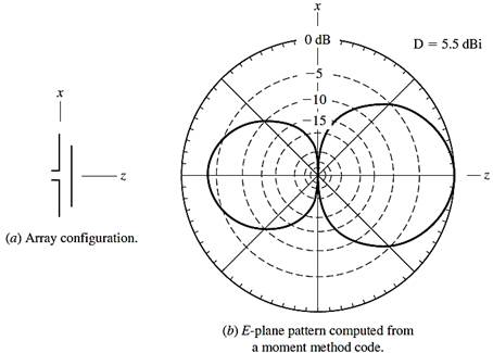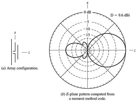 그림: 급전기와 지향기에 의한 방사패턴. 급전기 길이 0.47λ, 반사기 길이 0.482λ, 급전기-반사기 간격 0.20λ, 도선 직경 0.0085λ. 다이폴 단독 지향도 2.15dBi가 6.4dBi로 증가된다 [Stutzman].