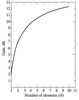 그림: 도선간격이 0.15λ로 균일할 경우 야기 안테나 소자 수에 따른 이득[Green]