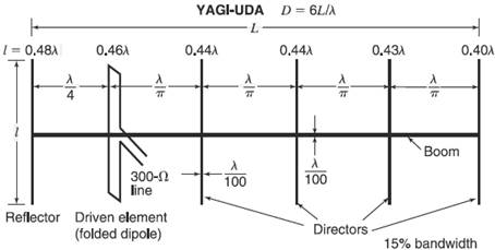 그림: Folded dipole에 의해 급전된 야기 안테나. 최대 이득 12 dBi[Kraus and