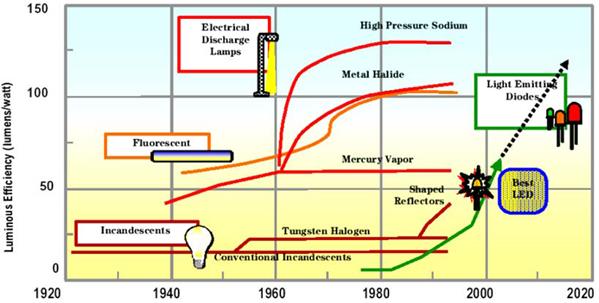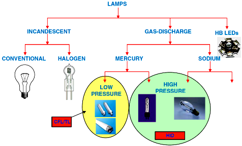 가정용과 상업용 조명으로 백열등(incandesent light), 형광등(flourescent light), 소형 형광등(CFL), LED 등이 사용되고 있으며 거리와 건물 조명에는 할로겐(sodium lamp, mercury halide lamp) 등이 사용되고 있다.