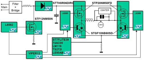그림: 1) HID 램프, 2) 전원장치 [ST Microelectronics]